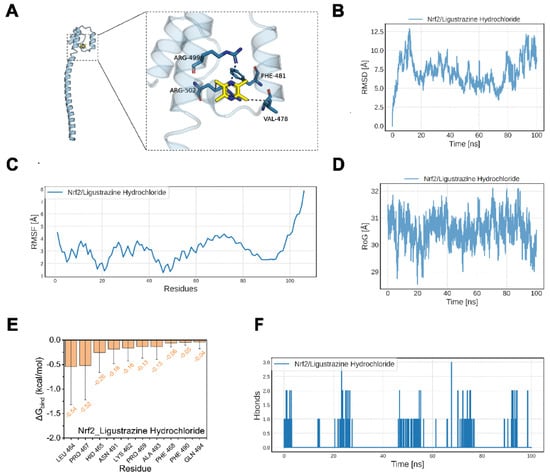 Potential regulation of LH towards the NRF2 signaling pathway. (A) NRF2 and LH molecular docking analysis. According to molecular docking studies, the binding mechanism is shown in general on the left and in detail on the right. (B) The RMSD of the complexes over time during the molecular dynamics simulation. (C) The RMSF was calculated from the molecular dynamics simulation trajectory. (D) The molecular dynamics simulation trajectory is analyzed using the radius of RoG. (E) The top ten amino acids that aid in protein and small molecule binding. (F) The number of hydrogen bonds between proteins and small molecules changes over the course of the molecular dynamics simulation.