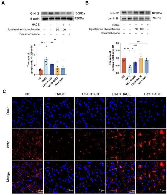Based on prior molecular docking and dynamics simulations, we examined LH’s influence on the nuclear translocation of NRF2 protein in HACE model rats. Using the western blot test, we first determined the expression level of NRF2 in the cytoplasm and nucleus of the rat brain. According to the findings, exposure to hypoxia considerably raised the amount of NRF2 expression in the cytoplasm. NRF2 expression was upregulated in the nucleus and dramatically reduced in the cytoplasm following LH pretreatment (Figure 7A,B). This indicates that LH promotes the translocation of NRF2 from the cytoplasm to the nucleus, facilitating its antioxidant function. Furthermore, as illustrated in Figure 7C, immunofluorescence results demonstrated that, in contrast to the NC group, NRF2 expression was significantly lower in the HACE group and progressively upregulated in the LH pretreatment group as the dose increased.