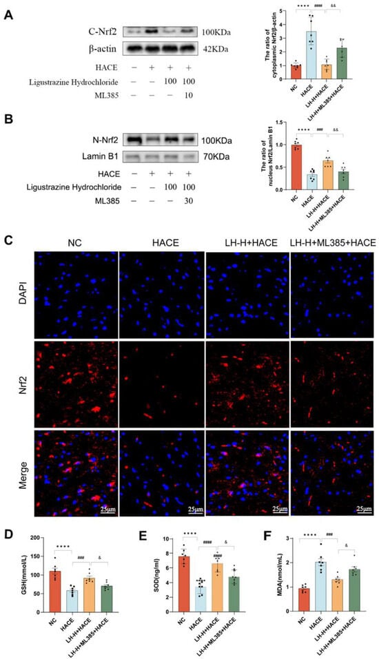 LH’s ability to combat oxidative stress relies on the NRF2 signaling pathway. (A,B) Western blot analysis (left) and quantitative analysis (right) of NRF2 expression. (C) Representative picture of NRF2 in an immunofluorescence segment of brain tissue (magnification 400×, scale = 100 μm). (D–F) GSH, SOD, and MDA levels in blood serum for each group. Results are expressed as mean ± SEM with a sample size of 7. Significance levels are indicated as follows: **** p < 0.0001 when compared to the NC group; ### p < 0.001, #### p < 0.0001 when compared to the HACE group; and & p < 0.1, && p < 0.01 when compared to the LH-H + HACE group.