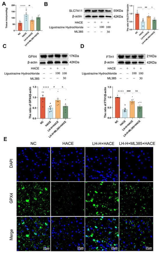 To verify that LH mitigates ferroptosis through NRF2 pathway activation, we administered the NRF2 inhibitor ML385 to HACE rats for further investigation. Initially, the overall iron levels in the brain tissue were assessed. In Figure 9A, it is evident that the LH-H + HACE group experienced a significant drop in brain tissue iron content compared to the HACE group. However, ML385 reversed LH’s downregulation, leading to an increase in iron content in the LH + ML385 + HACE group. Furthermore, western blotting was employed to detect the levels of ferroptosis-related proteins, including SLC7A11, GPX4, and FTH1. Figure 9B–D illustrates that the LH-H + HACE group exhibited increased expression levels of SLC7A11, GPX4, and FTH1 compared to the HACE group. The LH-H + ML385 + HACE group exhibited a reduction in the protein expressions of SLC7A11, GPX4, and FTH1 compared to the LH-H + HACE group. These results indicated that ML385 intervention promoted the expression of ferroptosis-related proteins. This study utilized immunofluorescence staining of GPX4, a key ferroptosis marker, to detect ferroptosis. The fluorescence expression of GPX4 in the LH-H + HACE group was considerably higher than in the HACE group; however, it was lower in the LH-H + ML385 + HACE group. These findings imply that ML385 reversed the inhibitory impact of LH on ferroptosis (Figure 9E).
