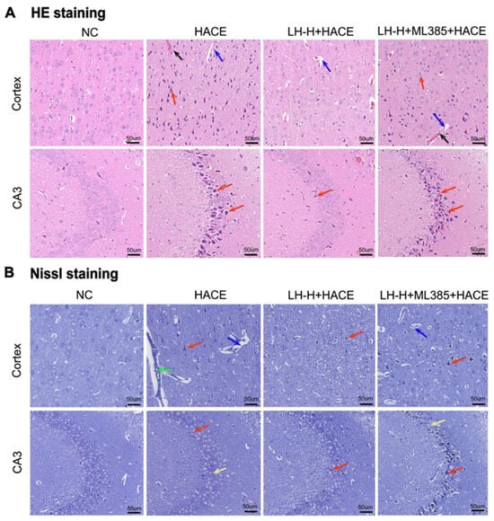 The protective effect of LH on HACE depends on the NRF2 Signaling Pathway. (A) Photomicrographs of brain tissue morphological changes using HE staining. (B) Photomicrographs of brain tissue morphological changes using Nissl staining. Bar = 50 μm, magnification: 20× (“→” black for vascular congestion; blue for widening of perivascular space; green for vasodilation; red for crumpling of neuronal cells; yellow for lysis of nuclear membrane or nucleoli).