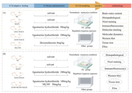 Schematic diagram of the experimental program of the research. (A) Study on the pharmacodynamics and ferroptosis phenotype of LH in HACE rats; (B) The mechanism study of LH on HACE rats through the NRF2 signaling pathway.