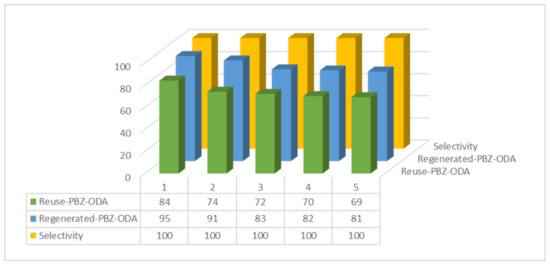 Results showed that PBZ-ODA worked effectively for up to five reuses (Chart 1). The first reuse had a decrease in catalytic activity of 18%, with 84% conversion compared to 98% with a fresh catalyst. The next four reuses yielded 74%, 72%, 70% and 69%, highlighting comparable catalytic activity. In contrast, regenerated PBZ-ODA had better results, losing only 7% yield in its first use and achieving 95% conversion. The last three runs maintained the catalytic performance, giving 83%, 82% and 81% conversion.