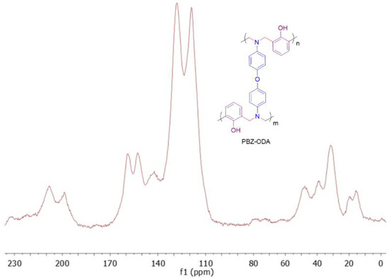 The 13C-NMR shows the aromatic peaks in the range of δ 110–220 ppm and peaks for aliphatic benzylic carbons of the polymer can be seen in the range of δ 10–60 ppm (Figure 1) [26,27].