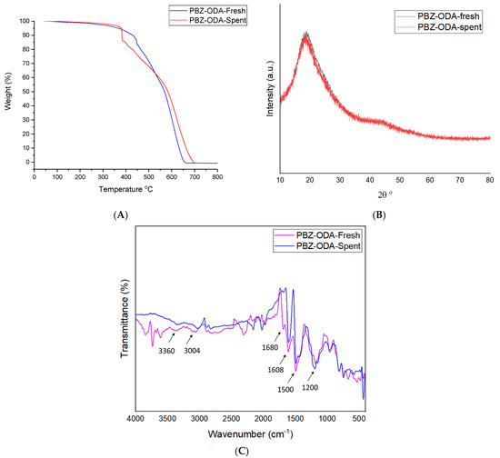 TGA (A), XRD (B) and FT-IR (C) for both fresh and spent PBZ-ODA.