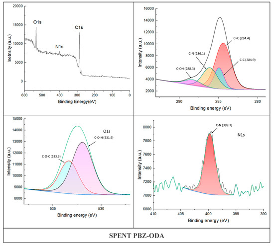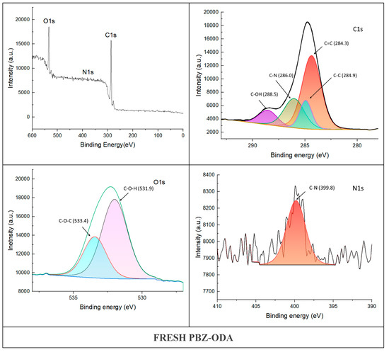XPS analysis was performed for further characterization of both fresh and spent PBZ-ODA catalysts (Figure 4) and was compared with previously reported data [31,32,33]. Wide-scan XPS showed signals of C, O and N, indicating the presence of PBZ chains. The C1s spectrum revealed specific peaks for C=C, C-C, C-N and C-OH at 284.3, 284.9, 286 and 288.5 eV for fresh PBZ-ODA and 284.4, 284.9, 286.1 and 288.3 eV for spent PBZ-ODA, respectively, aligning with PBZ structure. The O1s spectrum displayed specific peaks for C-O-H and C-O-C at 531.9 and 533.4 eV for fresh PBZ-ODA and 531.9 and 533.3 eV for spent PBZ-ODA, respectively. Furthermore, N1s spectrum showed a specific peak for C-N at 399.8 eV for fresh PBZ-ODA and 399.7 eV for spent PBZ-ODA. Overall, the results support the formation of PBZ chains.
