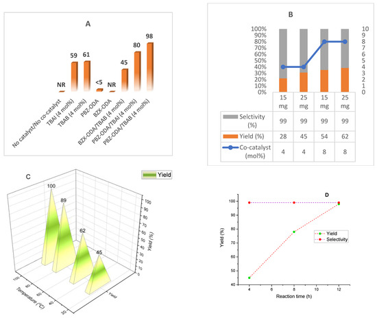 Optimization studies for PBZ-ODA-catalyzed cycloaddition of CO2 and epichlorohydrin: (A) tests to find high-yielding catalyst/catalytic system at RT for 12 h; (B) catalyst dosage study at RT for 4 h using TBAB as cocatalyst; (C) effect of reaction temperature for reaction run of 4 h and (D) reaction progress with time at RT.