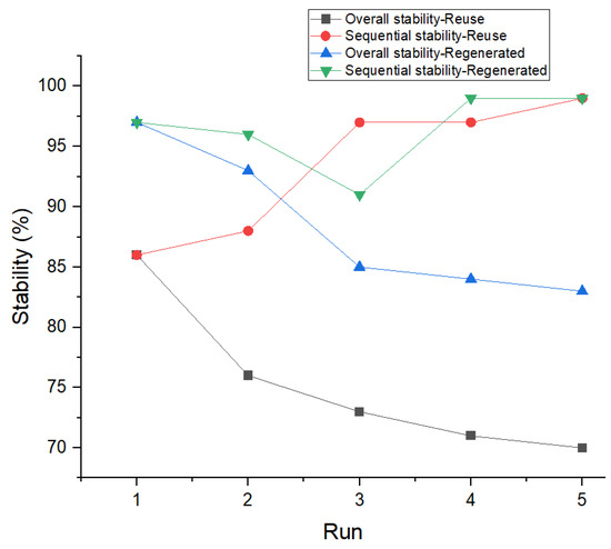 Catalyst stability was evaluated based on cyclic carbonate production compared to fresh catalyst (black and blue lines, indicating overall stability) and catalyst from the previous test run (red and green lines, indicating stability by comparing the yield of two consecutive reactions).