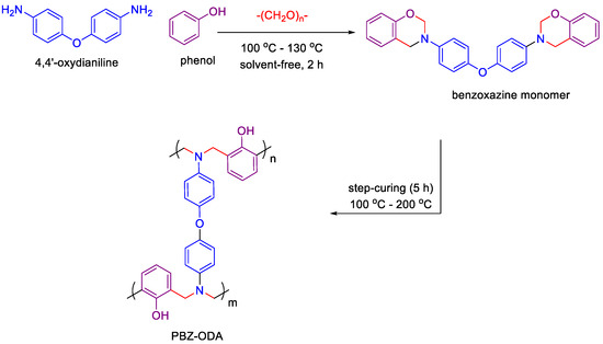 The polybenzoxazine, PBZ-ODA, was synthesized following the steps shown in Scheme 1. A solvent-free multicomponent one-pot reaction of phenol, paraformaldehyde and 4,4′-oxydianiline resulted in the formation of benzoxazine monomer. A heat-induced ring-opening polymerization reaction leads to the desired polymer, PBZ-ODA.