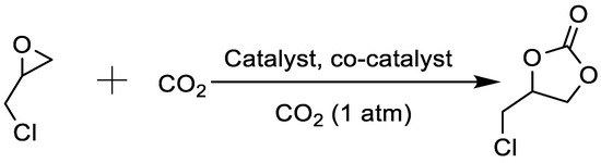 Carbon dioxide (CO2) emission is a significant concern for our planet since it contributes negatively to global climate change. The chemical fixation of CO2 is an important solution to the problems of rising energy needs and global warming. In general, CO2 capture, storage, and usage are critical to our long-term sustainability [1,2,3,4,5,6]. CO2, which comes from combustion waste, can be used as a carbon source to make chemicals and fuels, making it a key area of study [7]. CO2 is very stable, and a significant amount of energy is needed to activate and change it into other organic molecules. The energy needed to break the C=O bond in CO2 is 750 kJ mol−1, which is higher than other bonds like C−H and C−C. Therefore, the effectiveness of CO2 conversion processes largely relies on the type of catalyst used. The chemical transformation of CO2 into useful products is of high interest and also, feasible due to its easy availability as a C1 resource [8,9,10,11]. The 100% atom-economical cycloaddition of CO2 with epoxides to produce cyclic carbonate stands out as one of the most promising and greener ways of CO2 utilization that has several applications [12]. These products are used in various areas like solvents, extracting agents, and high-energy batteries due to their stability, solubility, and low toxicity, aligning with green chemistry principles [13].