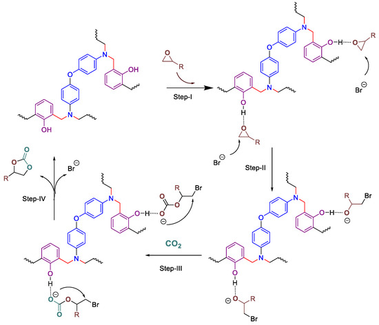 As shown in Scheme 3, the catalytic mechanism of polybenzoxazine involves the adsorption and activation of multiple epoxide molecules through the interaction between phenolic protons and oxygen atoms (Step-I) [34]. This forms a ring-opening intermediate through nucleophilic bromide attack on the less hindered β-carbon, stabilized by acidic phenol hydrogen (Step-II). CO2 reacts with the intermediate to generate acyclic esters (Step-III), which then undergo intramolecular cyclization to produce cyclic carbonates and release bromide (Step-IV). The catalyst then starts the next reaction cycle.