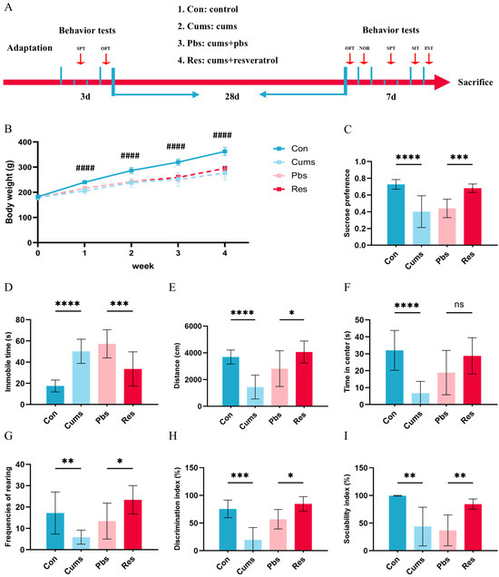 Resveratrol ameliorated depressive-like behaviors in rats: (A) Experimental design and timeline. (B) Body weight across groups (N = 10). (C) Sucrose preference index in sucrose preference test (SPT) (N = 10). (D) Immobility time in forced swimming test (FST) (N = 10). (E) Total distance of open field test (OFT) (N = 10). (F) Time in center of OFT (N = 10). (G) Frequencies of rearing in OFT (N = 10). (H) Discrimination index of novel object recognition test (NOR) (N = 6). (I) Sociability index of social interaction test (SIT) (N = 6). Statistical analyses are conducted using one-way ANOVA with Tukey’s post hoc test (#### p < 0.0001 (Cums vs. Con), ns: no statistical significance, * p < 0.05, ** p < 0.01, *** p < 0.001, and **** p < 0.0001).