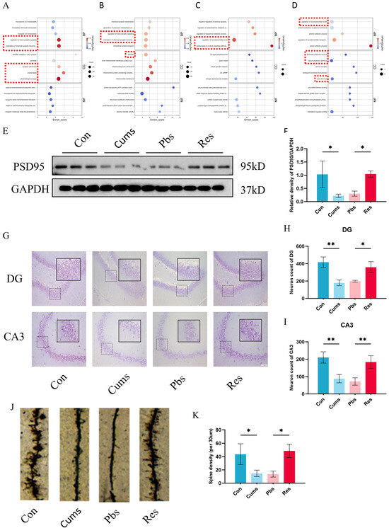 Resveratrol enhanced hippocampal neuroplasticity in rats: (A–D) Gene Ontology (GO) enrichment analysis of downregulated DEPs (Cums vs. Con) (A), upregulated DEPs (Cums vs. Con) (B), downregulated DEPs (Res vs. Pbs) (C), and upregulated DEPs (Res vs. Pbs) (D). (E,F) Relative expression of PSD95 normalized to GAPDH (N = 3). (G–I) Positive neuron counts in the DG and CA3 regions based on Nissl staining. Scale bars represent 75 μm. (J,K) Representative dendritic spine images and spine density measurements across the four groups (N = 3). Scale bar represents 5 μm. The red dotted box highlights changes associated with neuroplasticity. Statistical analyses are conducted using one-way ANOVA with Tukey’s post hoc test (* p < 0.05, ** p < 0.01.)
