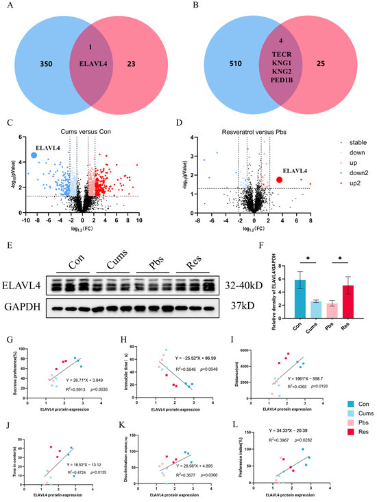 ELAVL4 as a key protein in the antidepressant effect of resveratrol: (A) Venn diagram of hippocampal proteomic showing downregulated DEPs (Cums vs. Con) and upregulated DEPs (Res vs. Pbs). (B) Venn diagram of hippocampal proteomic showing upregulated DEPs (Cums vs. Con) and downregulated DEPs (Res vs. Pbs). (C,D) Volcano plots of ELAVL4 expression in hippocampal proteomics, highlighting upregulated and downregulated proteins (FC > 1.2) and significantly altered proteins (FC > 1.5). (E,F) Relative expression of ELAVL4 normalized to GAPDH in the four groups (N = 3). The linear correlations between ELAVL4 expression and the sucrose preference index in the SPT (G), immobile time in FST (H), total distance of OFT (I), time in center of OFT (J), discrimination index of NOR (K), preference index of SIT (L). Statistical analyses are performed using one-way ANOVA with Tukey’s post hoc test (* p < 0.05).