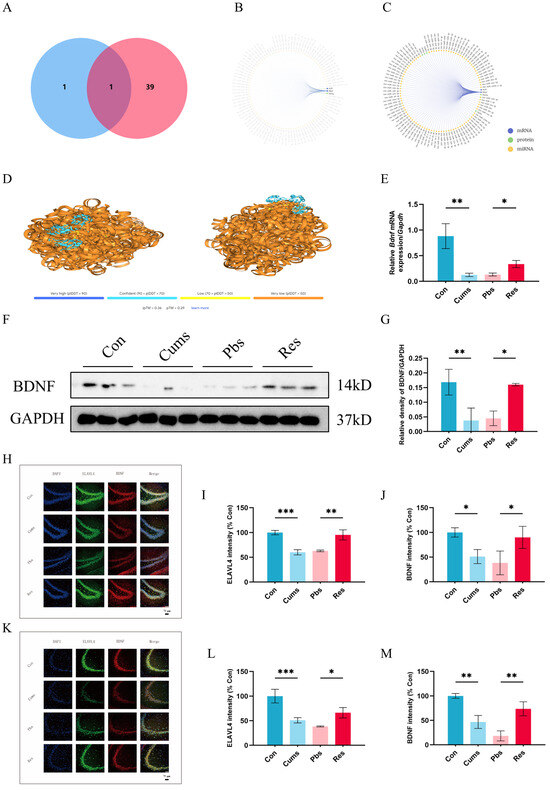 As a critical RBP, ELAVL4 plays an important role in neuroplasticity. We utilize the RNA Interactome Database (RNAInter) to identify its downstream target mRNAs, which shows two target mRNAs of ELAVL4 in rats: Bdnf mRNA and Beta-actin (Actb) mRNA. Concurrently, we search the NCBI database for proteins associated with neuroplasticity, resulting in 40 candidates. These two datasets yield a single overlap: Bdnf mRNA (Figure 4A). Meanwhile, RNAInter analysis confirms that Bdnf mRNA is a key downstream molecule of ELAVL4 in rats among the top 100 predicted interactions (Figure 4B,C). Figure 4D shows the structural binding between ELAVL4 and Bdnf mRNA visualized by AlphaFold 3.0. Furthermore, we examine the expression changes in Bdnf at the mRNA and protein levels. The results show that Bdnf mRNA and protein expression significantly decrease after CUMS (Cums vs. Con) (p < 0.01 for mRNA, p < 0.01 for protein, Figure 4E–G), while resveratrol intervention significantly increase their expression (Res vs. Pbs) (p < 0.05 for mRNA, p < 0.05 for protein, Figure 4E–G).