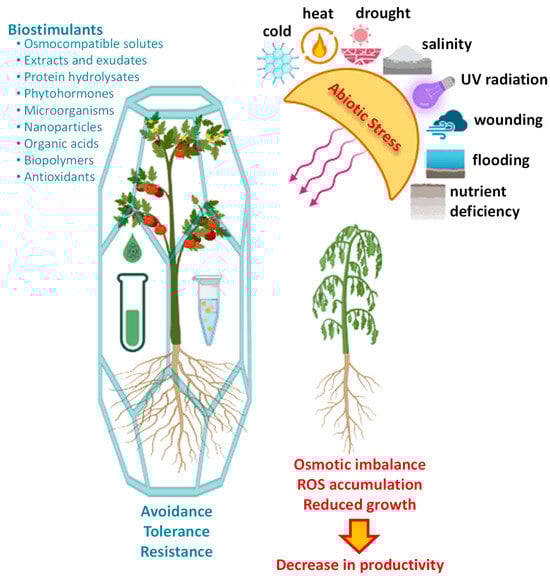 Agriculture and food production face unprecedented challenges in the 21st century, driven by climate change and the concomitant increase in abiotic stress on crop productivity [1]. Abiotic stressors such as drought, salinity, high temperatures, and nutrient deficiencies, among others, pose a significant threat to global food security (Figure 1). As climate change intensifies, the frequency and severity of these stressors continue to rise, requiring the development of innovative and sustainable agricultural practices [2]. In this context, the exploration of plant biostimulants as a strategic tool to enhance crop resilience against abiotic stress has garnered significant attention [3]. Biostimulants, comprising a diverse array of organic compounds derived from different sources (Figure 1), hold immense potential to elicit positive physiological responses in plants. These responses can enhance a plant’s capacity to withstand and recover from environmental challenges [4,5]. This comprehensive review provides an examination of the current state of knowledge regarding the use of plant biostimulants to mitigate abiotic stress in crops. Furthermore, this review emphasizes the potential of biostimulants to induce crop resilience under suboptimal environmental conditions and explores their impact on plant physiology, highlighting their promise as a critical tool for sustainable agriculture in the face of climate change.
