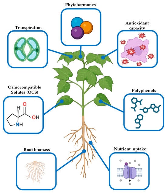 Phytohormones can alleviate the negative effects of abiotic stresses through different mechanisms, for instance, regulating stomatal opening and water use efficiency or protecting membranes and cellular structures through the enhancement of the antioxidant defense (Figure 2). In addition, phytohormones are able to promote nutrient uptake and metabolism to stimulate growth, enabling plants to better access essential resources under nutrient deficiency and environmental stress [32,33,34]. Considered one of the first studied biostimulants, their effectiveness can be influenced by factors such as their formulation and application method. Organic carriers and advanced technologies like nano-encapsulation have been developed to improve the delivery and efficiency of phytohormones. Application methods, including foliar sprays and soil treatments, provide flexible strategies to target specific crop requirements and environmental challenges. Ongoing research in this field is focused on developing innovative formulations and application techniques such as precision agriculture and controlled-release systems. Scientists are also investigating the synergistic effects of phytohormones with other biostimulants and nutrient management practices. Furthermore, long-term studies are being conducted to understand the impact of phytohormones on crop health and soil microbiomes, ensuring their sustainable use.