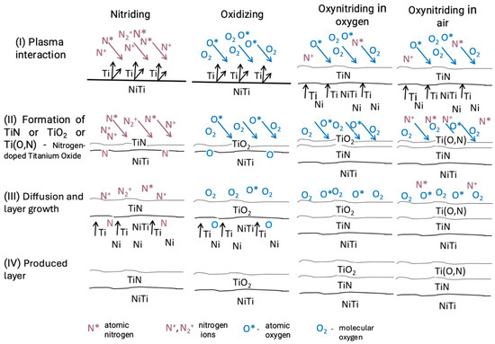 The layers produced through glow discharge nitriding are diffusion-based, characterized by high hardness and good adhesion to the substrate [17,71,87]. Depending on the applied gas atmosphere, nitriding, oxidation, or oxynitriding processes can be performed, combining nitriding and oxidation in a single technological cycle. The schematic of layer formation on NiTi alloy under glow discharge conditions is presented in Figure 1.