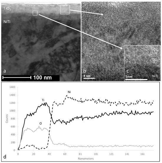 Figure 2. Microstructure (TEM) of titanium oxide—TiO2 (ac) surface layers produced by oxidation in an oxygen atmosphere without preliminary cathode sputtering. Microstructure of the surface layer (a), the structure of the oxide layer (b), and transition zone (c). Distribution of titanium, nickel, and oxygen in the studied layers (d) Reprinted with permission from Ref. [95]. Copyright 2025 Elsevier.