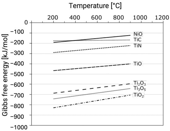 Figure 4. The Gibbs free energy of formation for titanium oxides, titanium nitride (TiN), titanium carbide (TiC), and nickel oxide (NiO) (based on [117]).