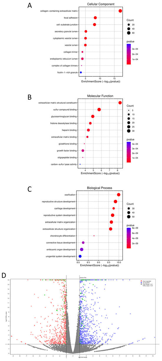 GO enrichment analysis and volcano plot of DEGs. This figure provides an overview of the GO enrichment and differential gene expression analysis of dermal fibroblasts with homozygous RSPRY1 mutations, as compared to CTRL fibroblasts. Each GO category, (A) Cellular Component (B) Molecular Function and (C) Biological Process, shows the enrichment score (−log10 of the p value) on the x-axis, with a dot size proportional to the number of genes contributing to the term and color intensity indicating statistical significance (p value). (D) The volcano plot shows the distribution of DEGs based on fold change (x-axis) and statistical significance (−log10 of the p value, y-axis). Red dots represent significantly upregulated genes. Blue dots represent significantly downregulated genes. Non-significant genes are shown in gray. Green dots represent the genes related to the TGF-β regulation of the ECM.