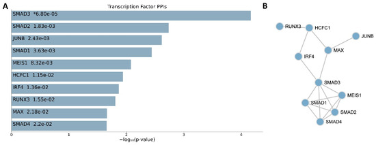 The observed significant enrichment of TGF-β signaling pathways highlights its central role in ECM regulation and suggests the involvement of key TFs orchestrating these changes in gene expression. The TFs that were enriched in the dataset were analyzed to investigate the associated regulatory mechanism, focusing on the TFs’ potential interactions and contributions to the molecular phenotype observed in RSPRY1-deficient fibroblasts. This analysis showed that SMAD2, SMAD3, and JUNB were the most significantly enriched TFs, highlighting their potential roles in regulating the changes in gene expression that were observed in fibroblast samples with homozygous RSPRY1 mutations (Figure 2A). SMAD2 exhibited the highest enrichment, which indicated a dominant role in the TGF-β signaling pathway, the most significantly enriched pathway in the dataset. A PPI network analysis further underscored the central role of these TFs. SMAD2 and SMAD3 formed a tightly connected cluster with other key TFs, including JUNB, SMAD1, and MES1, which indicated there was coordinated regulatory activity. Other important TFs, such as RUNX3, IRF4, and HCFC1, were also integrated into the network, which highlighted their potential contributions to the transcriptional landscape (Figure 2B).