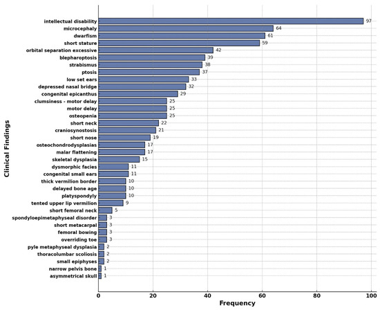 The frequency of clinical findings associated with RSPRY1 mutations. “Frequency” in this figure refers to the number of overlapping clinical findings associated with RSPRY1 mutations observed in the analyzed dataset. The DEGs list obtained from 2 patients carrying RSPRY1 mutations matched the genes defined in the OMIM database and related clinical phenotypes. Firstly, clinical findings phenotypically overlapping with RSPRY1 mutations were identified, and then a frequency analysis of these findings was performed. Clinical findings were grouped based on DisGenet terms, and the most common phenotypes were ranked. Each bar represents the number of times a specific phenotype was identified as overlapping with the genes linked to RSPRY1-associated pathways.