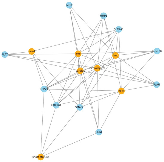 The top 10 genes and associated critical phenotypes network. This network visualization highlights the interactions between the top 10 genes with the highest association density and their linked phenotypic organ systems derived from analyzing RSPRY1-associated DEGs. Blue nodes represent the top 10 genes, including such key genes as SMAD3, COL1A1, and TRPV4, which are strongly associated with the TGF-β signaling pathway and ECM regulation. Orange nodes represent the phenotypic organ systems, including such critical features as eye, neck, short stature, and neurological phenotypes. Edges (lines) indicate the interaction or association between genes and phenotypic organ systems, with a denser connectivity representing a higher degree of association.