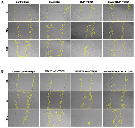 Wound-healing assay. Representative wound-healing assay images at 0, 24, 48, and 96 h. (A). Wound-healing dynamics in fibroblast groups, including CTRL (Cas9), RSPRY1 KO, SMAD3 KO, and RSPRY1 + SMAD3 + double KO cells without TGF-β supplementation, highlighting differences in wound closure rates across conditions. (B). Wound-healing dynamics in the same experimental fibroblast groups under TGF-β supplementation. Yellow outlines indicate wound borders at each time point. Scale bar, 100 μm.