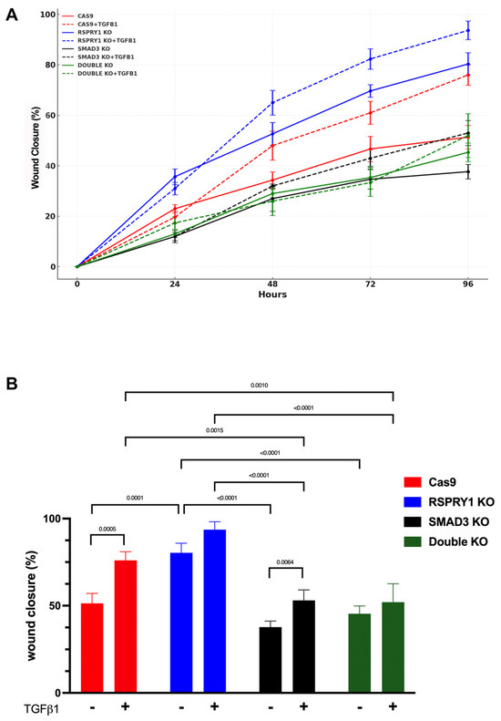 Scratch assays of dermal fibroblasts were used to assess wound-healing capacity. Cells (Cas9 CTRL, RSPRY1 KO, SMAD3 KO, and RSPRY1 + SMAD3 double KO) were cultured in 24-well tissue plates at a density of 70,000 cells well−1 in DMEM medium supplemented with 10% FBS until 90% confluence was achieved. Next, a linear scratch was created in the center of each well using a 1000 µL pipette tip, and the wells were washed with PBS to remove cellular debris. After scratch creation, the medium was replaced with (i) fresh 0.5% serum-supplemented culture medium to reduce the effect of proliferation or (ii) fresh 0.5% serum and 10 ng mL−1 human TGF-β1 recombinant protein (Cell Signaling Technology, Beverly, MA, USA) supplemented culture medium. The initial wound width and area were imaged using a Leica Dmi1 inverted microscope (Leica, Berlin, Germany) at the 0 h time point. Following the wounding process, cells were incubated for 24, 48, 72, and 96 h, and images were obtained at specified intervals to evaluate the rate of wound closure. The wound area at each time point was quantified relative to the initial wound area, providing a quantitative assessment of cell migration. Image analysis was performed using an ImageJ plugin for Fiji software v.2.14.0/1.54f [27]. The percentage of wound closure was calculated using the following equation: