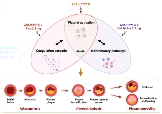 Strategies for Tackling Atherothrombosis in Patients with Atherosclerotic Cardiovascular Disease. Emerging evidence underscores the complex interplay between platelets, coagulation, and inflammation in the development of thrombus formation and atherothrombosis. Current therapeutic strategies aim to reduce cardiovascular events by disrupting these pathways that are responsible for atherogenesis and atherothrombosis. Dual antiplatelet therapy, combining aspirin and a P2Y12 inhibitor, primarily targets platelet reactivity to prevent thrombotic complications. A more comprehensive approach involves the simultaneous inhibition of platelets and coagulation using aspirin or a P2Y12 inhibitor in combination with low-dose rivaroxaban (2.5 mg twice daily). However, because both platelets and coagulation factors are integral to normal hemostasis, these therapies reduce thrombotic events but at the expense of increased risk of bleeding. An alternative approach focuses on combining aspirin or a P2Y12 inhibitor with colchicine to target both platelet activity and inflammatory pathways. By addressing inflammation, a key driver of atherothrombosis, this strategy has the potential to reduce thrombotic risk while minimizing the bleeding complications typically associated with intense antithrombotic therapies. Abbreviations: ASA: aspirin, P2Y12i: P2Y12 inhibitors; Riva: rivaroxaban.