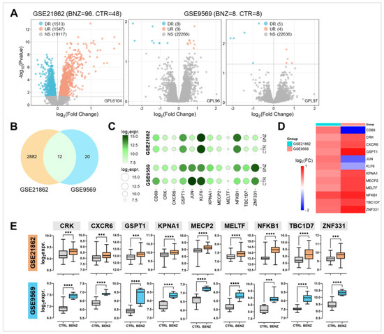 Differential expression analyses in the two GEO DataSets. (A) Volcano plots representing transcriptional expression data from GSE21862 (left) and GSE9569 (right). Light blue dots represent genes significantly downregulated (DR) in benzene-exposed versus non-exposed workers, while orange dots represent genes significantly upregulated (UR) in benzene-exposed versus non-exposed workers. Grey dots represent genes with non-significant (NS) changes. (B) Venn diagram illustrating the overlap of genes unique to each dataset and those shared between the datasets. (C) The bubble plot displays the relative expression of 12 significantly deregulated genes, with the size and color of the circles indicating the mean log2 expression values (log2expr.). (D) Heatmap of the averaged log2 fold change (log2FC) for each of the 12 genes across the two datasets. (E) Box plots showing the median expression levels ± SD of the 9 genes consistently upregulated in both datasets. *** p < 0.001; **** p < 0.0001.