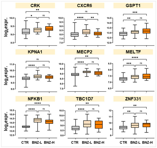Stratification of significantly deregulated genes in GSE21862 based on benzene exposure. Box plots showing the median expression levels ± SD of the 9 benzene-related genes. Workers were stratified into low-dose benzene exposure (BZN-L: 0.1–5 ppm), high-dose benzene exposure (BZN-H: >5 ppm, including exposures exceeding 10 ppm), and non-exposed controls (CTR). * p < 0.05; ** p < 0.01; *** p < 0.001; **** p < 0.0001; ns = not significant.