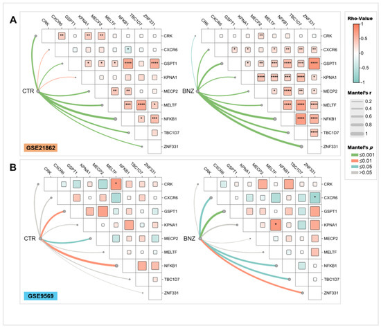 Correlation of the expression of significantly deregulated genes. Correlograms of Spearman correlations and Mantel analysis between deregulated benzene-related genes. (A) In the GSE21862 dataset, comparing CTR (control, left) and BNZ (benzene-exposed, right) samples. (B) In the GSE9569 dataset, comparing CTR (left) and BNZ (right) samples. Light red color within cells indicates positive correlations (rho values between 0 and 1), while light blue color indicates negative correlations (rho values between 0 and −1). The size of the squares in each cell is proportional to the magnitude of the rho value. Only significant correlations with p-values < 0.05 are reported. The lines denote Mantel test results, with the line width representing Mantel’s r statistic and the color representing Mantel significance (Mantel’s p). * p < 0.05; ** p < 0.01; *** p < 0.001; and **** p < 0.0001.