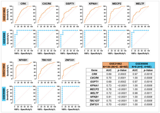 ROC curve analysis to assess the validity of gene expression in discriminating between benzene-exposed and non-exposed worker samples. ROC plots for the GSE21862 (light blue) and GSE9569 (orange) datasets are shown, with a corresponding table displaying the AUC and p-value for each of the nine benzene-associated genes. The AUC values reflect the discriminatory power of the genes in distinguishing exposed and non-exposed workers, with a higher AUC indicating stronger predictive capability.