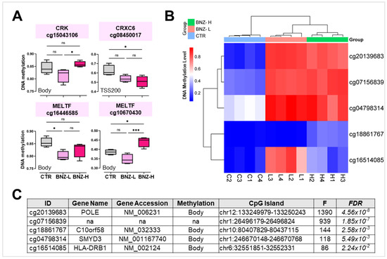 DNA methylation dataset analysis (GSE50967). (A) Box plots showing the median DNA methylation levels ± SD of CRK (cg15043106), CXCR6 (cg08450017), MELTF (cg16446585), and MELTF (cg10670430) in BNZ-L (low exposure to benzene: 0.06 ± 0.01 mg/m3, equivalent to 0.02 ppm), BNZ-H (high exposure to benzene: 7.68 ± 2.57 mg/m3, equivalent to 2.59 ppm), and CTR (non-exposed controls: 0.06 ± 0.01 mg/m3, equivalent to 0.02 ppm). (B) Heatmap of the mean DNA methylation levels of the five most deregulated DNA methylation hotspots, grouped into BNZ-L (L1-4), BNZ-H (H1-4), and CTR (C1-4). (C) Table reporting the main features of DNA methylation hotspots, including the gene ID, gene name, gene accession, methylation level, CpG island status, F-value, and FDR. * p < 0.05; *** p < 0.001; and ns = not significant.