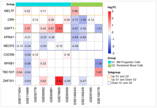 Gene expression matrix of 9 benzene-associated genes in AML GEO gene expression datasets. Boxes represent the averaged log2 fold change (log2FC) for each of the 9 genes. Red boxes indicate upregulated genes with log2FC between 0 and 3, while blue boxes represent downregulated genes with log2FC between 0 and −3. Unfilled white boxes indicate genes with non-significant fold changes. The datasets are grouped into G1 (light blue) with bone marrow (BM) progenitor cell-derived samples and G2 (light green) with peripheral blood nucleated cell-derived samples. MELTF is consistently upregulated in both G1 and G2 (red boxes), while CRK and GSPT1 show upregulation in G1 but downregulation in G2 (yellow boxes). KPNA1 and MECP2 are consistently downregulated in both G1 and G2 (blue boxes).