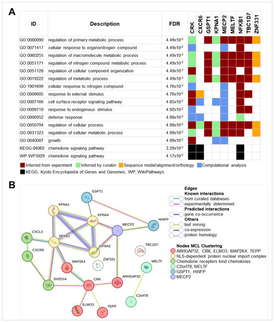 Additionally, STRING network analysis (Figure 7B) revealed a dense web of functional interactions between the protein products of the genes, with the exception of ZNF331 and TBC1D7, which appeared functionally isolated. The analysis identified distinct clusters of interactions. One cluster suggested roles in cytoskeletal remodeling and intracellular signaling, highlighting genes such as CRK and MAP2K4, while another emphasized nuclear-cytoplasmic transport processes involving KPNA1 and NFKB1. A separate cluster underscored the chemokine signaling roles driven by CXCR6, further supporting its immune-related functions. Additional clusters hinted at roles in iron homeostasis, translational control, and chromatin dynamics, with MECP2 showing indirect interactions with both NFKB1 and GSPT1.