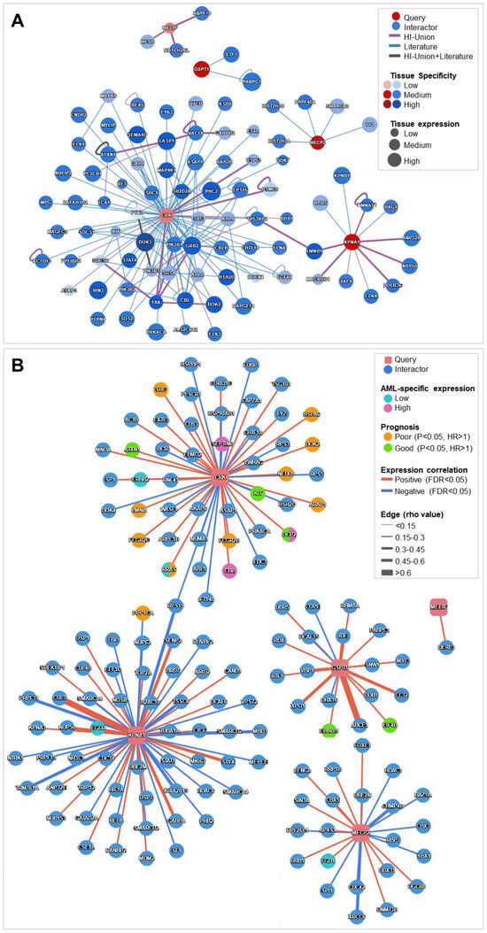 The Human Reference Protein Interactome Mapping Project (HuRI) online tool was used to investigate human binary protein interactions. Specifically, the tissue-specific function was applied to identify genome-wide, tissue-preferentially expressed genes in whole blood [65]. The Protein Interaction Network Analysis (PINA 3.0) platform was also employed to examine cancer-specific interactomes. Results were filtered to include only direct interactions with correlation coefficients > 0.3 within the AML-specific network, which integrates data from TCGA-LAML [66].