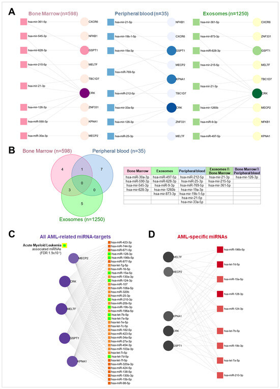 miRNet miRNA-target interaction network of differentially expressed benzene-related gene targets. (A) Network plots highlighting the interactions (grey nodes) between the 9 benzene-associated gene targets and 8 miRNAs in bone marrow (left), peripheral blood (center), and exosome (right) samples. (B) Venn diagram showing intersections between miRNet queries and a table listing miRNAs that are post-transcriptional regulators of benzene-related gene targets belonging to each Venn subgroup. (C) Network plot depicting the interactions (grey nodes) between 5 benzene- and AML-associated gene targets and 38 miRNAs; miRNAs specifically involved in AML pathology are highlighted in green and yellow. (D) Network plot of 5 benzene- and AML-associated gene targets and 9 miRNAs of the AML-disease subgroup, with interactions (grey nodes).