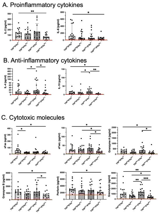 2.2. The TNFHIFNγH Group Has Higher Levels of Proinflammatory and Anti-Inflammatory Cytokines and Cytotoxic Molecules Than the TNFN-LIFNγN-L Group