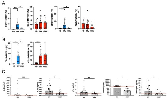 2.3. IMV Patients Exhibit a High Frequency of T Cell and Monocyte TNFR+1 and Hyperactive Production of Cytokines and Cytotoxic Molecules