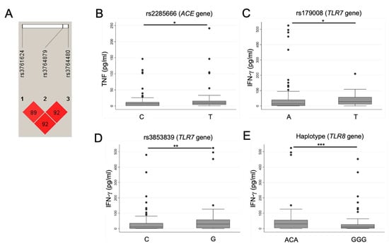 2.4. SNPs in TLR7 and TLR8 Genes Are Related to TNF and IFN-γ Levels in COVID-19 Patients