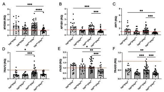 2.6. TNFHIFNγH Patients Have Higher Levels than TNFN-LIFNγN-L Patients of Molecules Associated with TLR Signaling and Cell Death Mediated by the TNF/TNFR1 Pathway