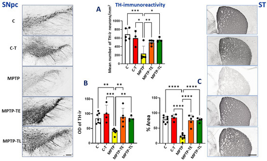 Tyrosine hydroxylase (TH) immunohistochemistry in the substantia nigra pars compacta (SNpc) and striatum (ST) of control mice (C, n = 5 in SNpc and n = 7 in ST), trained control mice (C-T, n = 3 in SNpc and n = 4 in ST), untrained mice with induced Parkinsonism (MPTP, n = 5 in SNpc and n = 7 in ST), mice with induced Parkinsonism that underwent early-onset training (MPTP-TE, n = 5 in SNpc and n = 5 in ST), and mice with induced Parkinsonism that underwent late-onset training (MPTP-TL, n = 3 in SNpc and n = 4 in ST). Representative images of the TH immunohistochemical staining in SNpc (SNpc left panel) and in the striatum (ST right panel). Magnification of microphotographs by 100 times for SNpc and 40 times for the striatum. (A) Mean number of TH-immunoreactive neurons in SNpc, (B) optical density (OD) of TH-immunoreactivity, and (C) % of immunoreactive area (%Area) in the dorsal striatum. Values are presented as the mean ± SD with scatter plots of individual data. (A) For TH-immunoreactive neurons in the SNpc, a one-way ANOVA confirmed a significant main effect of Group (F (4, 16) = 7.623; p = 0.0012). MPTP mice presented strongly reduced TH labeling relative to both control groups. While the mean number of the TH-ir neurons was reduced in MPTP relative to control groups, this reduction was restrained when physical exercise was administered. Both early-onset and late-onset treadmill training favorably affected the preservation of the dopaminergic phenotype of neurons in the SNpc. (B) For TH labeling in the striatum, statistical analysis yielded the main effect of Group for OD (F (4, 22) = 8.225; p = 0.0003) and (C) for %Area (F (4, 22) = 31.93; p < 0.0001). Neurotoxin administration reduced the density of dopaminergic afferents in the striatum, while exercise counteracted this reduction, regardless of when it was applied. Statistical significance between the groups was calculated using the Newman–Keuls test (* p < 0.05, ** p < 0.01, *** p < 0.001, and **** p < 0.0001). Scale bars: 100 µm for SNpc and 500 µm for ST.
