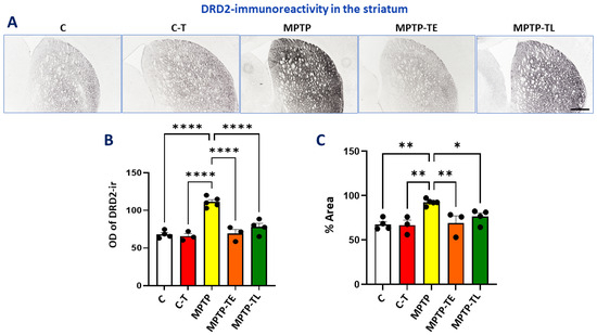 In our study, DRD2 immunohistochemical staining in the striatum showed the strongest intensity in untrained MPTP-treated mice (MPTP group) and was significantly stronger than in all other groups (Figure 2A). In the MPTP group, DRD2 immunoreactivity was statistically significantly higher by 64% in OD and 37% in %Area compared to group C. Training alone did not significantly affect the intensity of DRD2 immunoreactivity; there were slight decreases in OD and %Area (3% and 2%, respectively) in the C-T group compared to group C. Training in MPTP mice prevented the increase in DRD2-ir staining intensity. There were no significant differences between untreated control groups (C and C-T) and trained MPTP groups (MPTP-TE and MPTP-TL). There was only a 2% increase in OD and a 2% increase in %Area in the MPTP-TE group compared to group C, and there was a 5% increase in OD and a 4% increase in %Area compared to the C-T group. Late-onset training (MPTP-TL group) resulted in a 15% increase in OD and a 13% increase in %Area compared to group C as well as a 19% increase in OD and a 14% increase in %Area compared to the C-T group (Figure 2B,C).