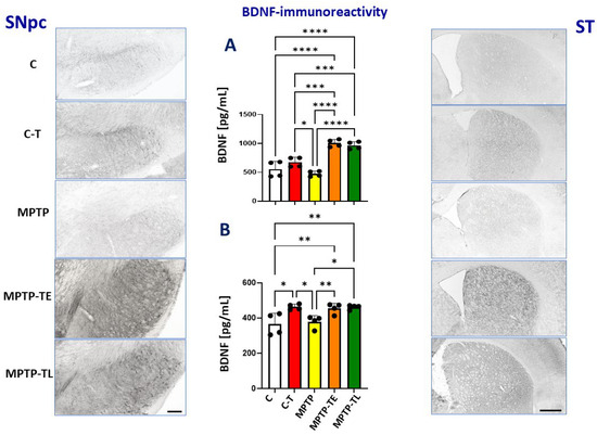 Brain-derived neurotrophic factor (BDNF) immunohistochemistry in the substantia nigra pars compacta (SNpc) and striatum (ST) of control mice (C, n = 4), trained control mice (C-T, n = 4), untrained mice with induced Parkinsonism (MPTP, n = 4), mice with induced Parkinsonism that underwent early-onset training (MPTP-TE, n = 4), and mice with induced Parkinsonism that underwent late-onset training (MPTP-TL, n = 4). Representative images of the BDNF immunohistochemical staining in SNpc (SNpc left panel) and the striatum (ST right panel). Magnification of microphotographs by 100 times for SNpc and 40 times for the striatum. Quantitative analysis of the levels of BDNF by ELISA in the midbrain (A) and the striatum (B). Values are presented as the mean ± SD with scatter plots of individual data. (A) Quantitative analysis of the BDNF level in the midbrain with one-way ANOVA confirmed a significant main effect of Group (F (4, 15) = 31.49; p < 0.0001). Untrained MPTP mice did not show a strongly reduced BDNF level compared to the control group (group C), whereas BDNF levels were elevated when physical exercise was administered in the control (C-T) and reached even higher levels when training was combined with MPTP treatment (MPTP-TE and MPTP-TL). (B) Quantitative analysis of the BDNF level in the striatum with one-way ANOVA yielded the main effects of Group (F (4, 15) = 7.357; p = 0.0017). Similarly, as observed in the midbrain, untrained MPTP mice did not show a strongly reduced BDNF level compared to control group (group C), whereas BDNF levels were similarly elevated when physical exercise was administered in the control (C-T) and when training was combined with MPTP treatment (MPTP-TE and MPTP-TL). Statistical significance between the groups was calculated using the Newman–Keuls test (* p < 0.05, ** p < 0.01, *** p < 0.001, and **** p < 0.0001). Scale bars: 100 µm for SNpc and 500 µm for ST.