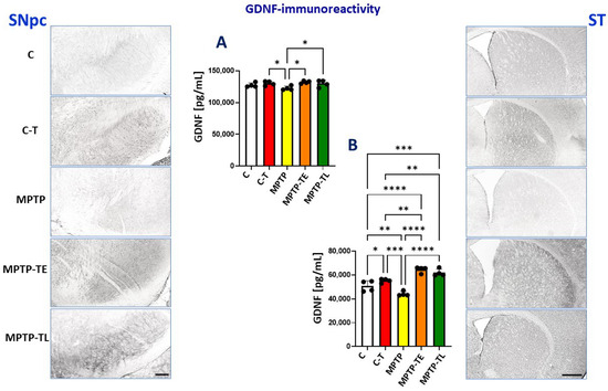 Glial-derived neurotrophic factor (GDNF) immunohistochemistry in the substantia nigra pars compacta (SNpc) and striatum (ST) of control mice (C, n = 4), trained control mice (C-T, n = 4), untrained mice with induced Parkinsonism (MPTP, n = 4), mice with induced Parkinsonism that underwent early-onset training (MPTP-TE, n = 4), and mice with induced Parkinsonism that underwent late-onset training (MPTP-TL, n = 4). Representative images of the GDNF immunohistochemical staining in SNpc (SNpc left panel) and the striatum (ST right panel). Magnification of microphotographs by 100 times for SNpc and 40 times for the striatum. Quantitative analysis of the levels of GDNF by ELISA in the midbrain (A) and the striatum (B). Values are presented as the mean ± SD with scatter plots of individual data. (A) Quantitative analysis of the GDNF level in the midbrain with one-way ANOVA showed a significant main effect of Group (F (4, 15) = 3.976; p = 0.0215). MPTP mice showed a non-significantly decreased GDNF level compared to the control group (group C). GDNF levels were not reduced in trained MPTP mice when compared to control groups (C, C-T). (B) Quantitative analysis of the GDNF level in the striatum with one-way ANOVA yielded the main effects of Group (F (4, 15) = 31.76; p < 0.0001). Unlike in the SNpc, untrained MPTP mice showed significantly decreased GDNF levels compared to control groups, whereas GDNF levels were elevated when physical exercise was administered in both control and MPTP-treated mice. The pro-trophic effect of exercise was particularly pronounced in mice receiving MPTP, both in the early-onset and late-onset training groups. Statistical significance between the groups was calculated using the Newman–Keuls test (* p < 0.05, ** p < 0.01, *** p < 0.001, and **** p < 0.0001). Scale bars: 100 µm for SNpc and 500 µm for ST.