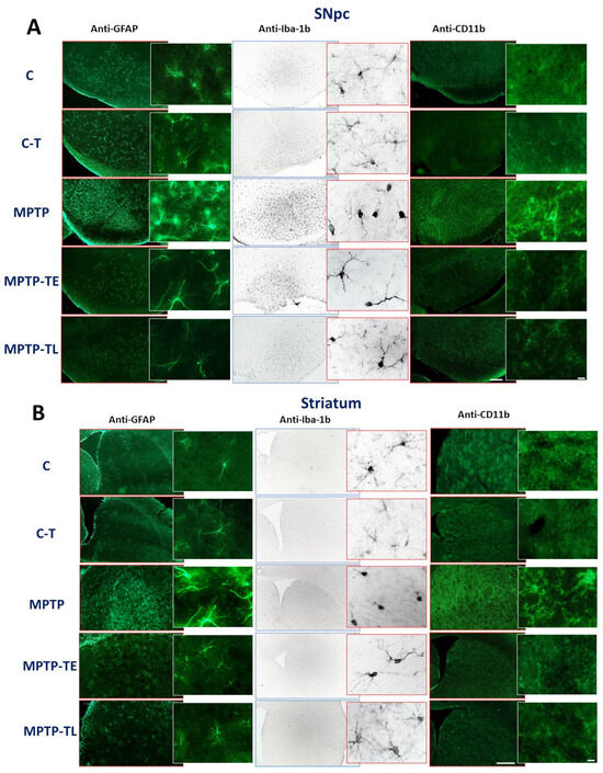 Immunohistochemical staining against glial fibrillary acid protein (GFAP), ionized calcium-binding adaptor molecule 1 (Iba-1b), and integrin CD 11b in the (A) substantia nigra pars compacta (SNpc) and (B) striatum (ST) of control mice (C), trained control mice (C-T), untrained mice with induced Parkinsonism (MPTP), mice with induced Parkinsonism that underwent early-onset training (MPTP-TE), and mice with induced Parkinsonism that underwent late-onset training (MPTP-TL). Representative images of GFAP, Iba-1b, and CD11b immunohistochemical staining in SNpc and ST. Scale bars: 100 µm for SNpc, 500 µm for ST, and 10 µm for insertions.
