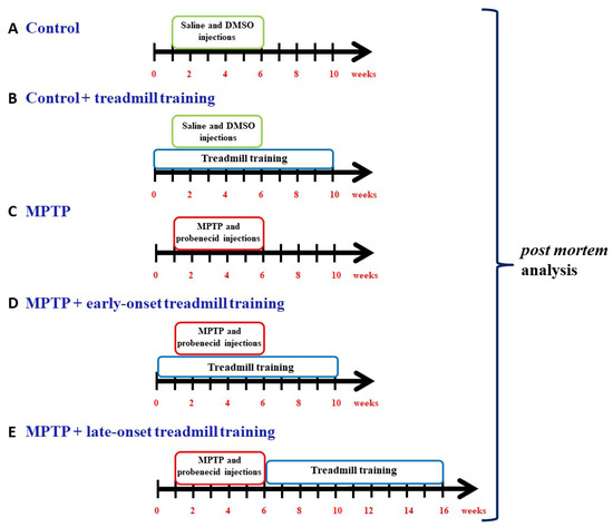 All procedures used in this study were approved by the First Local Ethics Committee for Animal Experiments in Warsaw and were performed in accordance with the Polish Law on the Protection of Animals and the National Institute of Health’s Guide for the Care and Use of Laboratory Animals (Publication No. 85-23, revised 1985) and the European Union Council Directive (63/2010/EU). Studies were performed in 12-week-old male C57BL/6J mice, purchased from the Medical University of Bialystok (Poland) and delivered to the Nencki Institute of Experimental Biology 1 month before the experiments. In this study, 35 control (vehicle-treated) and 52 mice treated with MPTP were used. Mice were kept on a 12:12 h light/dark cycle, with temperature and humidity maintained at 23 ± 1 °C and 55 ± 5%, respectively; food and water were freely available. With regards to the chronic MPTP administration protocol, mice were given 10 subcutaneous doses of MPTP 12.5 mg/kg dissolved in saline (Santa Cruz Biotechnology, San Diego, CA, USA, Cat No sc-206178; Axon Medchem, Groningen, The Netherlands, Cat No 1075) in combination with the intraperitoneal application of probenecid (250 mg/kg dissolved in dimethyl sulfoxide (DMSO); Sigma-Aldrich, St. Louis, MO, USA, Cat No P8761) injections for 5 weeks. The purpose of probenecid administration was to inhibit the rapid excretion and disintegration of MPTP and its metabolites from the brain and kidney; probenecid alone has no significant neurotoxic effect, but in combination, it potentiates the neurotoxicity of MPTP [78]. Control mice received saline and DMSO injections only. The mice were thus divided as follows: 19 mice in a control group (C), 16 mice in a control treadmill training group (C-T), 19 mice in an MPTP-injected group (MPTP), 17 mice in an MPTP-injected trained group that started treadmill training 1 week before the induction of Parkinsonism (MPTP-TE, i.e., MPTP + early-onset treadmill training), and 16 mice in an MPTP-injected trained group that started treadmill training immediately after the induction of Parkinsonism (MPTP-TL, i.e., MPTP + late-onset treadmill training) (Figure 6). The treadmill training lasted 40 min/day at 15 cm/s (360 m/day) and was performed 5 days/week for 10 weeks.
